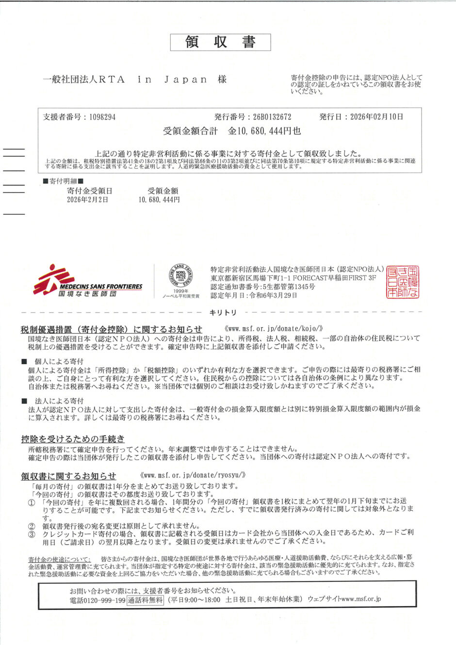 2025/12/25 – 31の間で開催した『RTA in Japan Winter 2025』で得られたTwitch収益について、税金を引いた額を『国境なき医師団』に寄付いたしました。